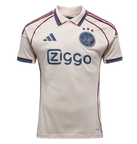 This is an Adidas Ajax Amsterdam 2025/2026 third jersey in the color “Halo Ivory” with maroon and navy detailing.